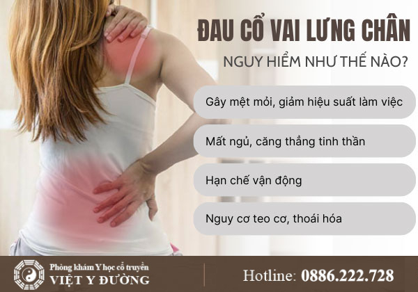 Đau cổ vai lưng chân là tình trạng đau nhức tại nhiều vị trí cơ xương. Tình trạng này thường xuất hiện âm ỉ hoặc đột ngột tùy cơ địa. Người bệnh có thể bị đau lan tỏa, ảnh hưởng đến vận động hằng ngày.