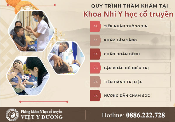 Tại Phòng khám Y học cổ truyền Việt Y Đường , khoa Nhi Y học cổ truyền áp dụng quy trình khoa học. Các bước được thực hiện rõ ràng, đảm bảo an toàn và hiệu quả cho bệnh nhi gồm: