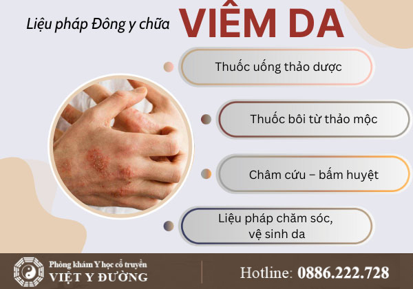 Viêm da là tình trạng da bị đỏ, ngứa, bong tróc hoặc nổi mẩn, có thể xuất hiện ở nhiều vùng khác nhau trên cơ thể như mặt, tay, chân, da đầu hoặc lưng. Theo Đông y, viêm da thường liên quan đến rối loạn chức năng gan, phế, thận và khí huyết không lưu thông.